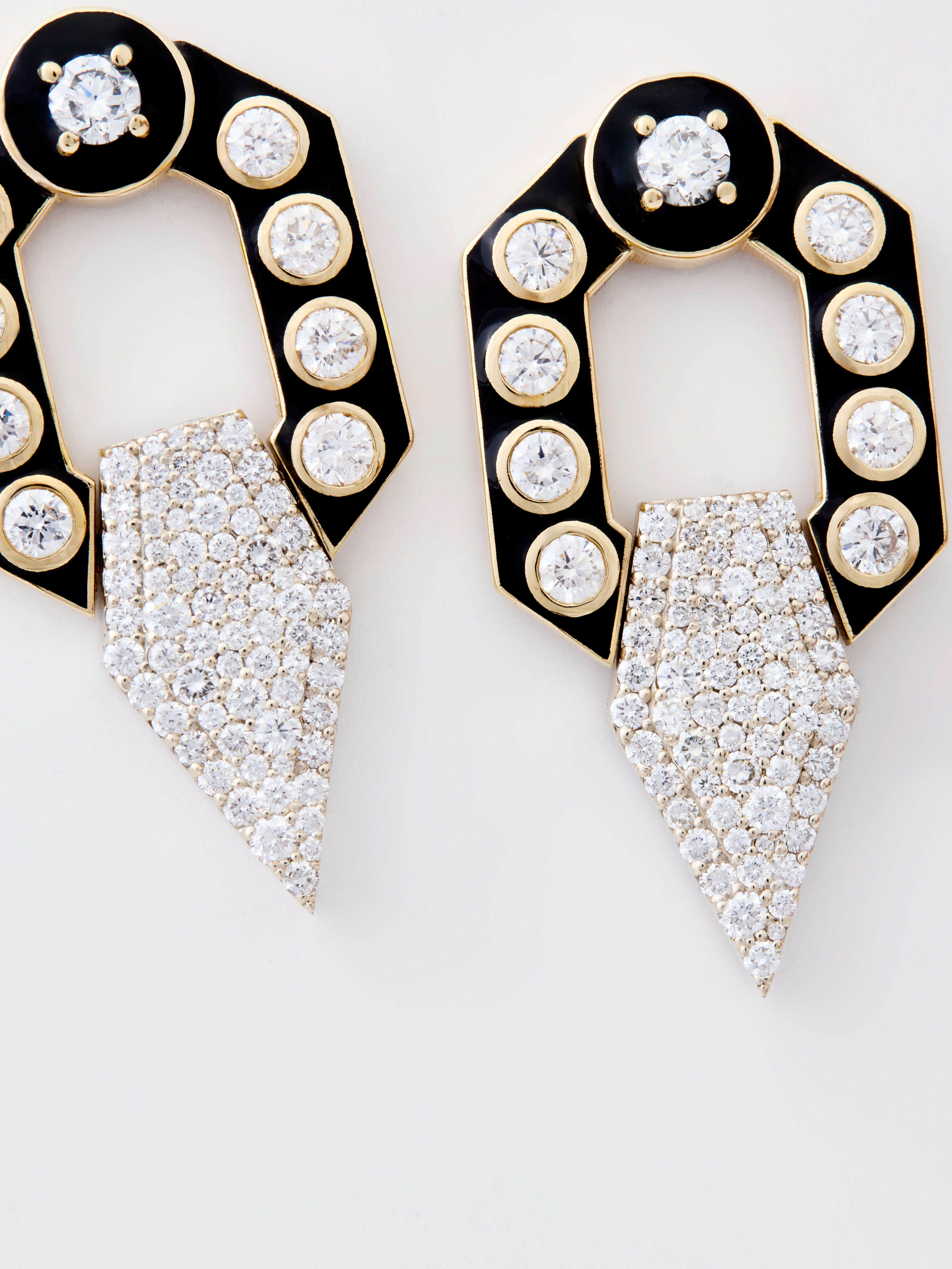 A pair HAL earrings, handcrafted in 18K gold, round diamonds set in black enamel with pave set diamonds.